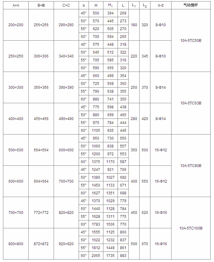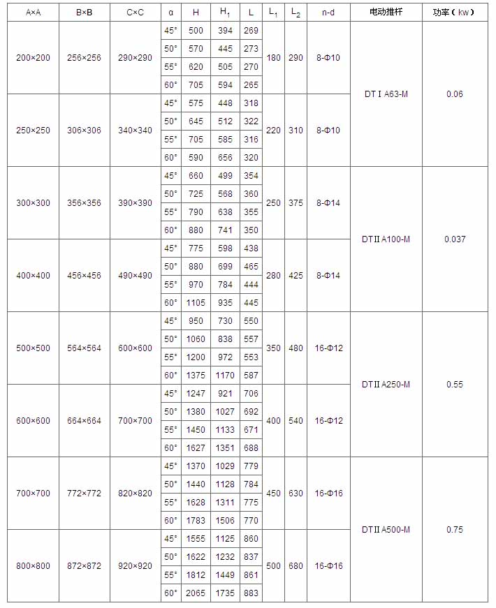 A×A | B×B | C×C | α | H | L | L1 | L2 | n-d | 電動裝置 | 功率(kw) |